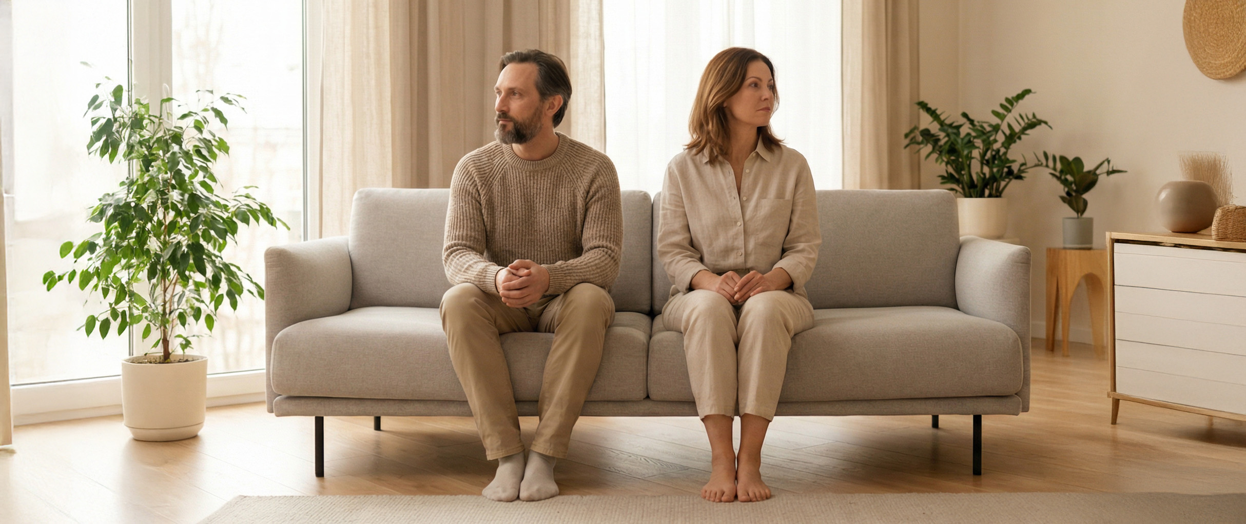 Paar sitzt sich schweigend gegenüber, emotionale Distanz nach einem Vertrauensbruch in der Beziehung